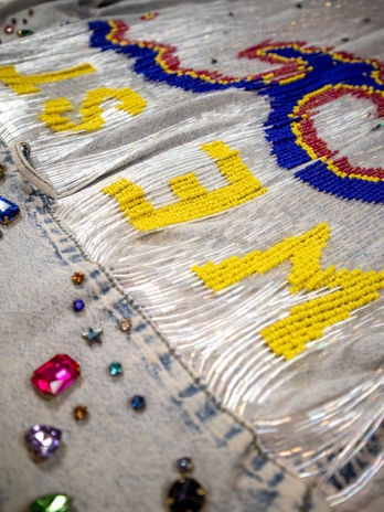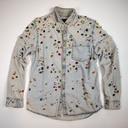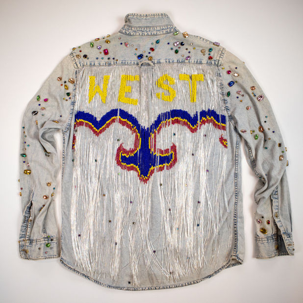 A statement fringe western denim shirt, elevated with custom graphics and glistening crystal embellishments.